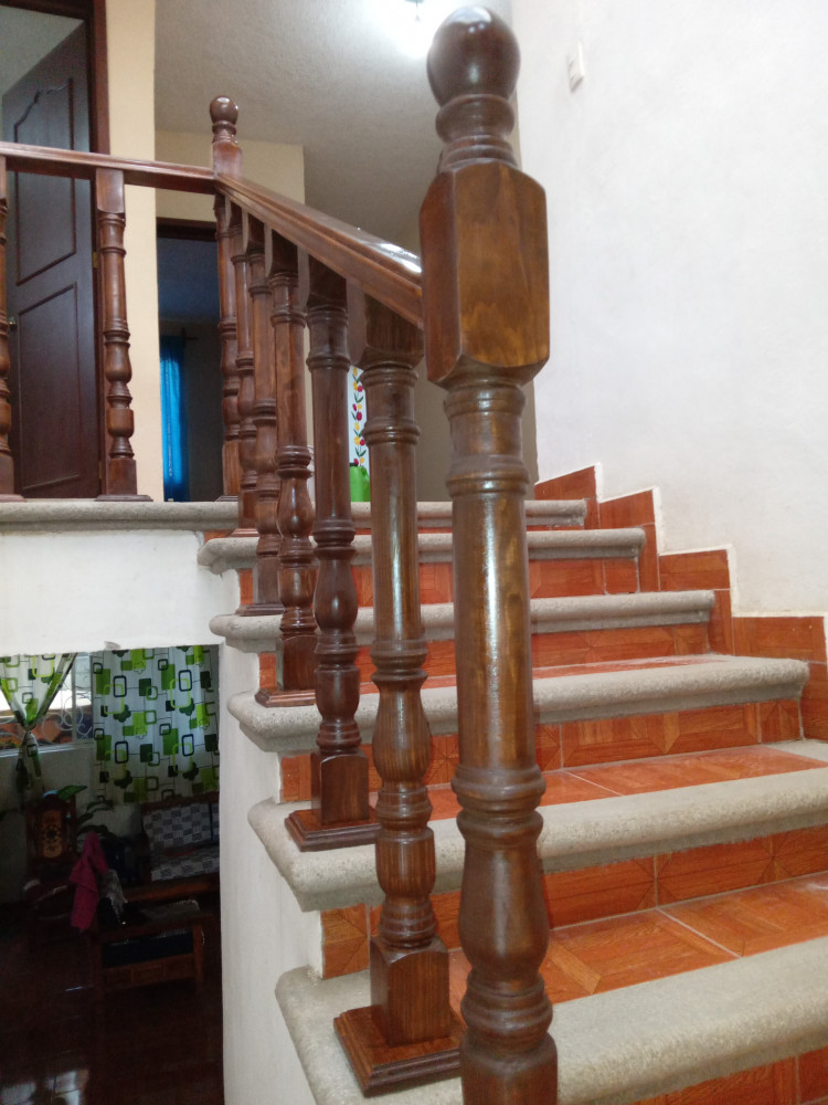 Barandal clásico con arranques y balastros en madera de pino entintado nogal clásico y puertas para lavavo en madera de cedro.